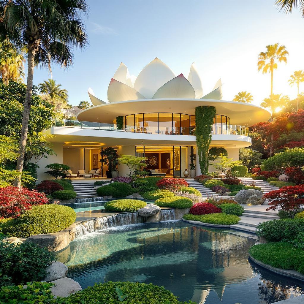 A stunning mid-century modern mansion inspired by the elegance of a lotus flower, featuring multi-level terraces and flowing water features that seamlessly blend into a peaceful Zen garden, all basking under the warm glow of a sunlit day. This architectural masterpiece embodies a serene yet luxurious Hollywood vibe, with artistic flourishes that capture the imagination and elevate the spirit.