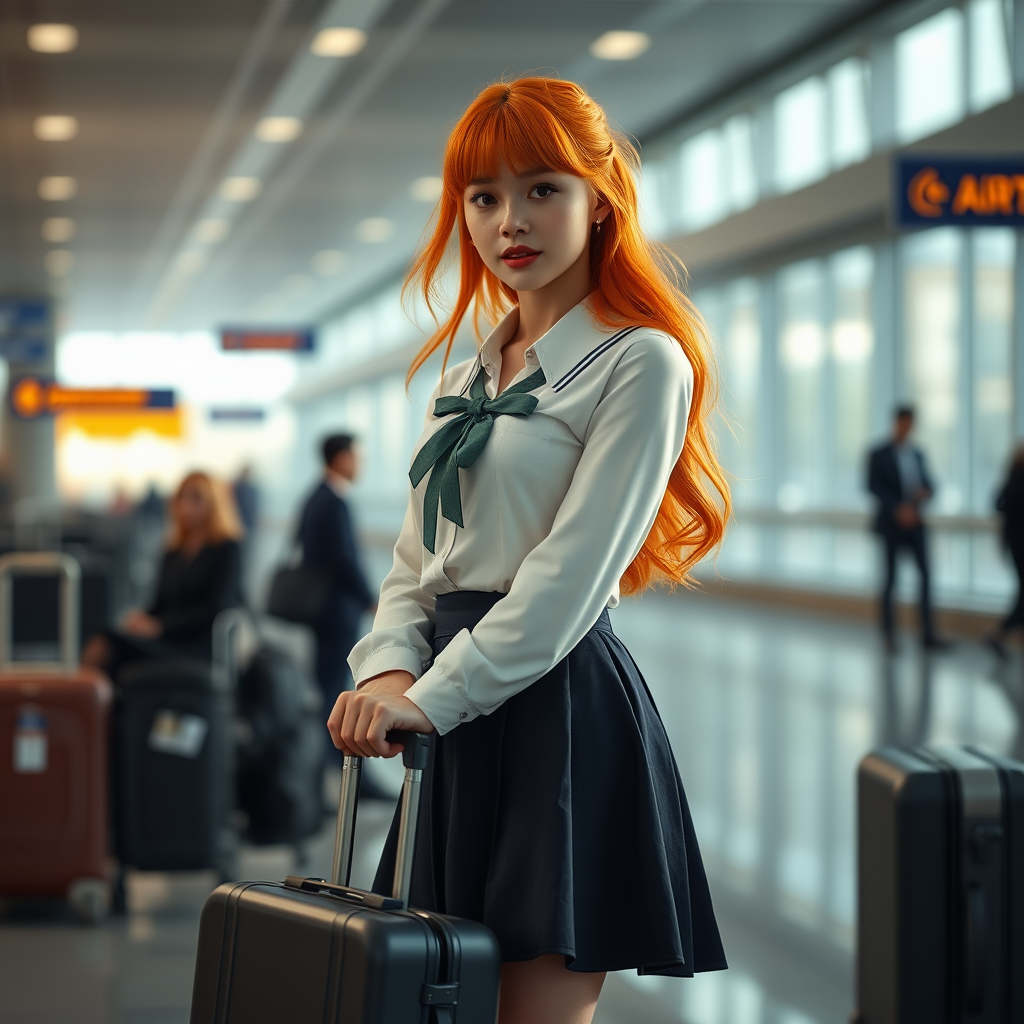 A stunning mid shot of an elegantly dressed woman with vibrant orange hair, holding a suitcase in an airport interior. The portrait is influenced by the intricate storytelling style of Harriet Powers, showcasing a hyperrealistic portrayal of a schoolgirl in a magical school student uniform. She is wearing a skirt and high socks, capturing the essence of a still from a live action movie. This digital artwork, trending on CG Society, combines realism with a touch of fantasy, resembling a promotional photo still of a magical realm, with an air of anticipation as she embarks on her journey.