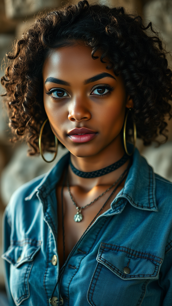 A stunning mixed-race girl dressed as Thor, captured in 8k UHD with a DSLR, featuring soft lighting and high quality. Her attire includes a denim shirt paired with goth jewelry, showcasing a necklace and loop earrings. Her curly hair frames her face, adding to her captivating look. The photo embraces a slight film grain effect for an artistic touch, ensuring the composition remains high-res and focused. Her striking presence is highlighted without imperfections, maintaining exquisite proportions and detail. The blurred background subtly enhances the portrait, drawing attention to her engaging expression and unique ensemble.