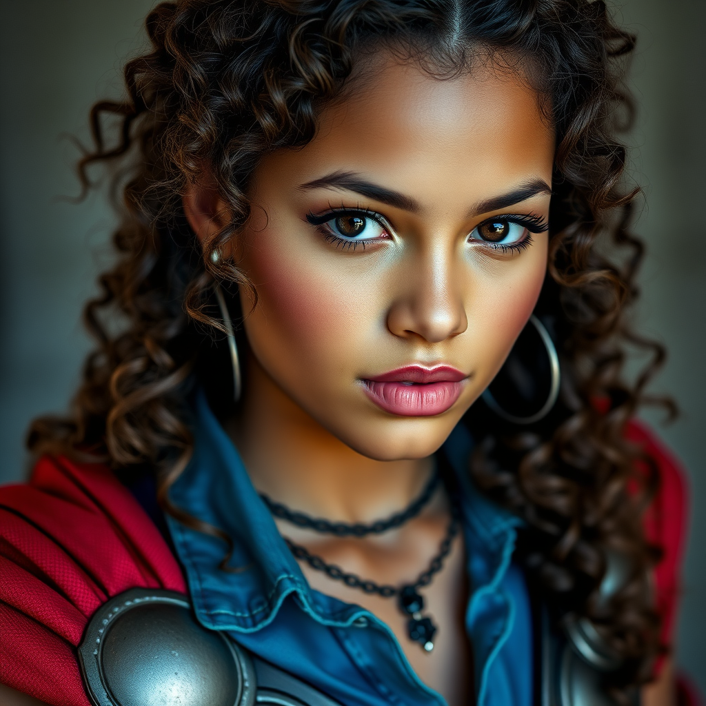 A stunning mixed-race girl dressed as Thor, featuring curly hair and adorned with gothic jewelry including necklace and earrings. She wears a denim shirt under the Thor costume, capturing a vibrant scene in 8k UHD with soft lighting and high-quality film grain. The image emphasizes her beauty with airbrushed elements, ensuring no visual distractions with a clean background. The photograph aims for a DSLR-level sharpness, focusing on perfect proportions and smooth lines, while maintaining a slightly artistic blur in the background to enhance depth. The unique combination of superhero attire and contemporary fashion accents creates an eye-catching, dynamic portrait.