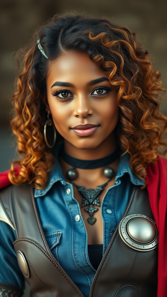 A stunning mixed-race girl dressed as Thor, showcasing a captivating blend of elegance and power. Shot in 8k UHD with a DSLR, the image features soft lighting and high-quality film grain for a cinematic feel. Her vibrant curly hair complements the ensemble, and she wears a gothic necklace with earrings that add an edgy touch. The denim shirt layered beneath her costume introduces a casual element, while everything is set against a beautifully blurred background, enhancing her prominence. Her expression is confident, with a playful hint of crossed eyes adding a unique twist to the portrayal. Despite being slightly airbrushed, the portrait maintains a sense of authenticity and charm, harmoniously balancing strength and beauty in a single frame.
