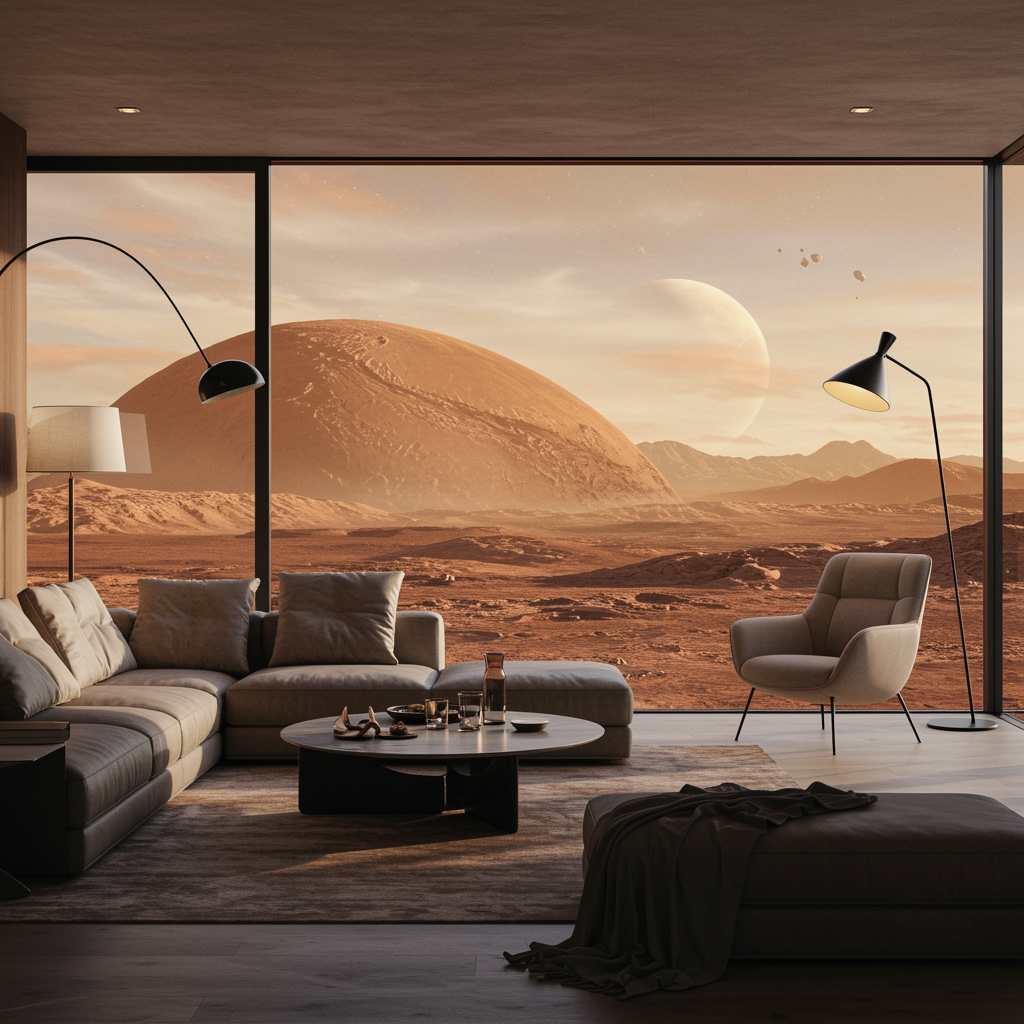 A stunning modern living room features expansive windows framing the breathtaking martian landscape outside, blending fantasy and reality in a captivating scene. This digital art piece is crafted with extreme detail, achieving a photorealistic quality reminiscent of a painting by Greg Rutkowski, with visual storytelling akin to Bryan Organ's style. The composition is captured in high-resolution 8k, offering a CG unity-like clarity. Soft, matte finishes and subtle lighting cast a serene atmosphere, while imaginative elements enhance the otherworldly experience of viewing the enigmatic Martian surface from the comfort of a tastefully designed interior.