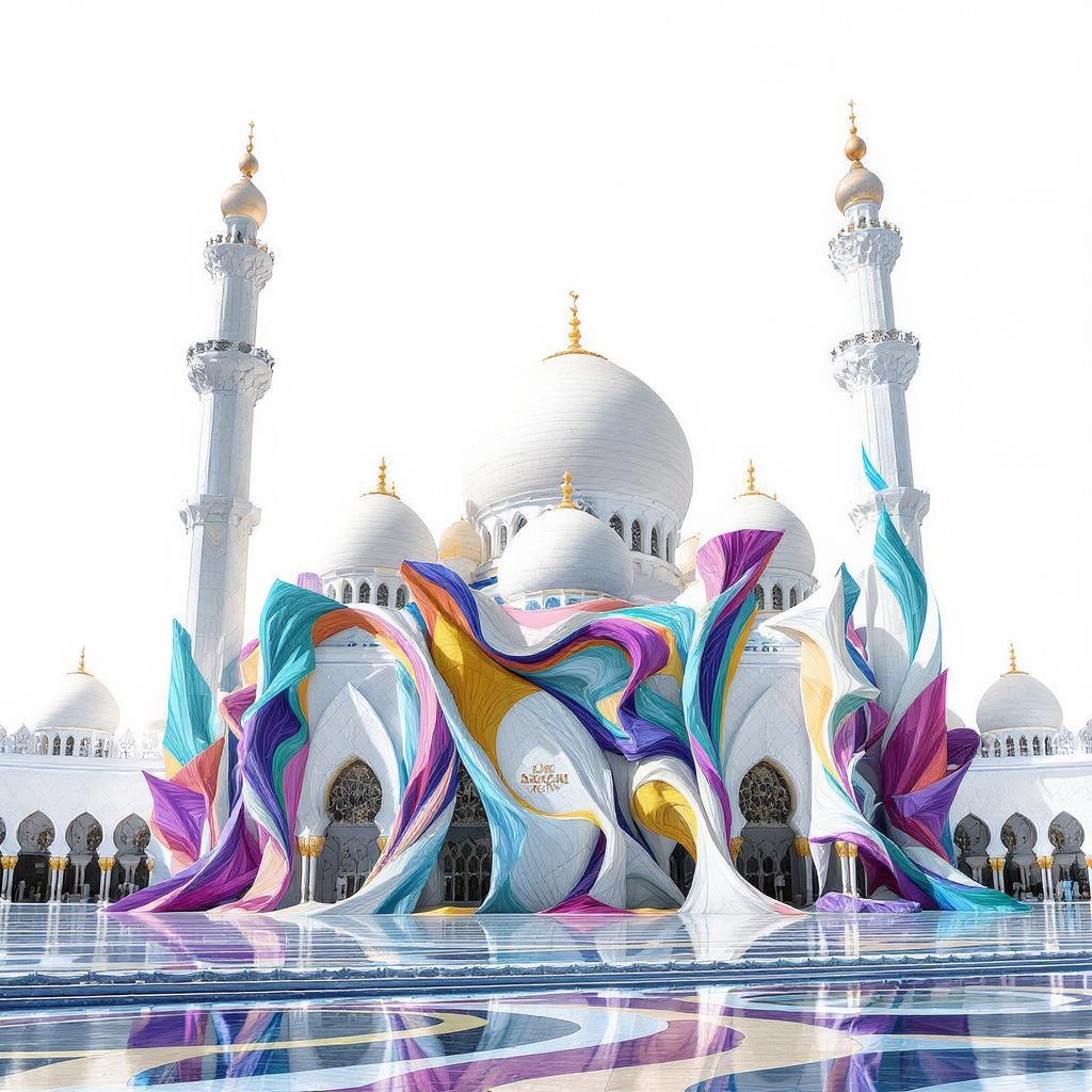 A stunning mosque set against a pristine white background, brought to life with the vibrant, imaginative styles of Lois van Baarle and Greg Rutkowski, infused with Artgerm's flair. The architecture features mesmerizing abstract shapes, with soft lines and elegant curves that weave through the structure. An array of beautiful colors blend together in a surreal, fantasy-like manner, creating a piece that is both high resolution and a marvel of geometric abstraction. The overall composition feels otherworldly and enchanting, with a sense of harmony and balance.