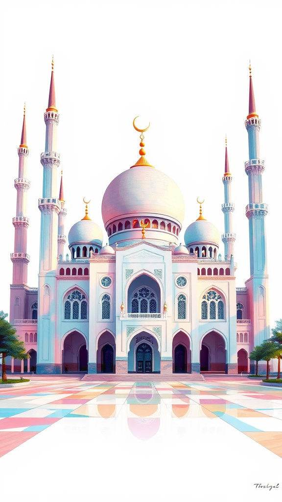 A stunning mosque set against a white background, inspired by the painting styles of Lois van Baarle, Greg Rutkowski, and Artgerm. The scene features an array of beautiful colors and abstract shapes, with soft lines and elegant curves creating a sense of surreal fantasy. The high-resolution artwork incorporates elements of geometric abstraction, creating a harmonious blend of form and color. The design captivates with its imaginative interpretation and artistic creativity, adding unique touches while maintaining the essence of a fantastical, dreamlike mosque.