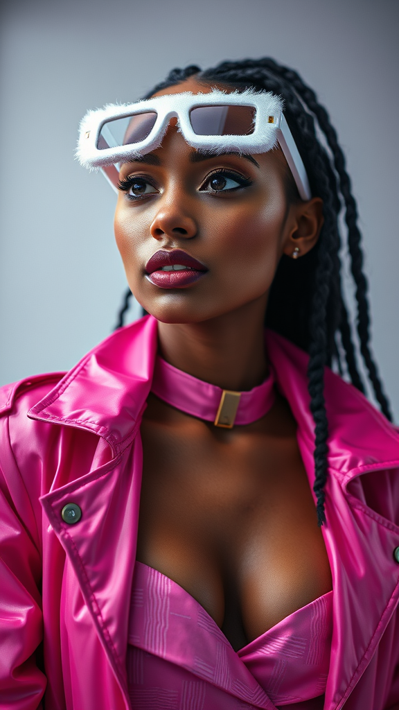 A stunning multiracial girl wearing a vibrant pink jacket with chiseled cheeks and tearful eyes, embodying a powerful yet elegant presence. The outfit features a low strapless neckline with a bold choker, crafted in a style reminiscent of liquid metal and deconstructed tailoring. Captured through the lens of webcam photography with a touch of duckcore influence, the scene showcases bold curves and an innovative chinapunk aesthetic. This look is a collaboration between Jacquemus and Moncler, highlighted by white translucent fur sunglasses. The hyper-realistic imagery captures every detail in 8k resolution, bringing the vision to life with creative flair.
