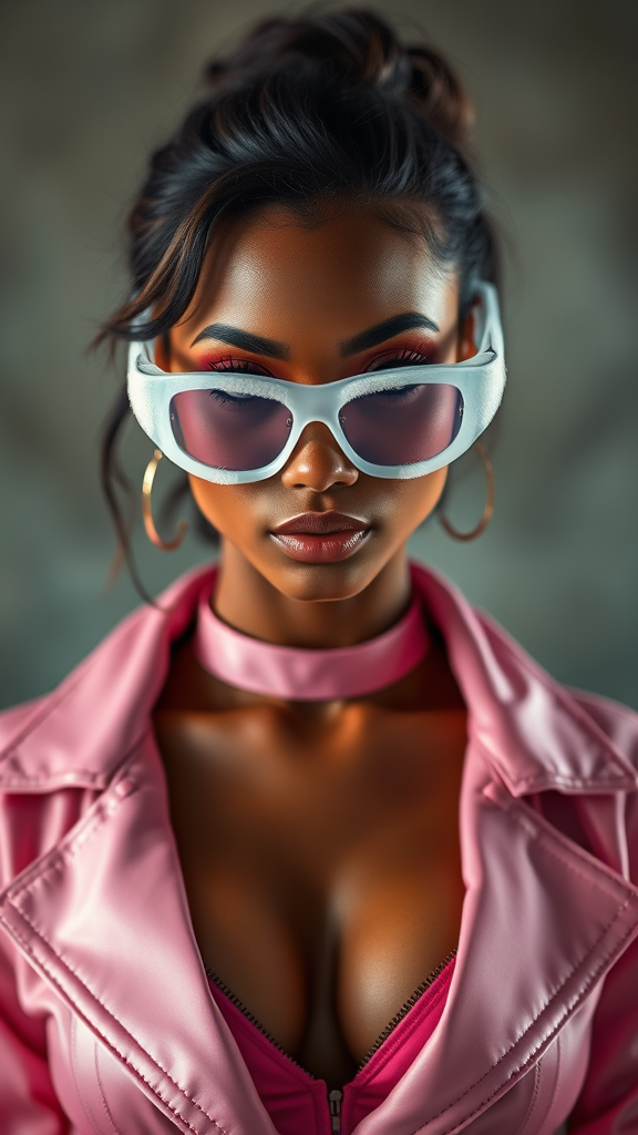 A stunning multiracial woman in a pink jacket with deconstructed tailoring and chiseled cheeks gazes into the camera, her tearful eyes captivatingly intense. She's dressed in a strapless, low neckline outfit, accentuated by a bold choker and embodying dominatrix allure. Her style is reminiscent of liquid metal, with a futuristic, chinapunk aesthetic and the bold curves of duckcore fashion. She wears exclusive white, translucent fur sunglasses from a Jacquemus and Moncler collaboration, adding a touch of avant-garde. Captured in hyper-realistic, detailed 8k resolution, her look exudes a captivating blend of modernity and elegance.