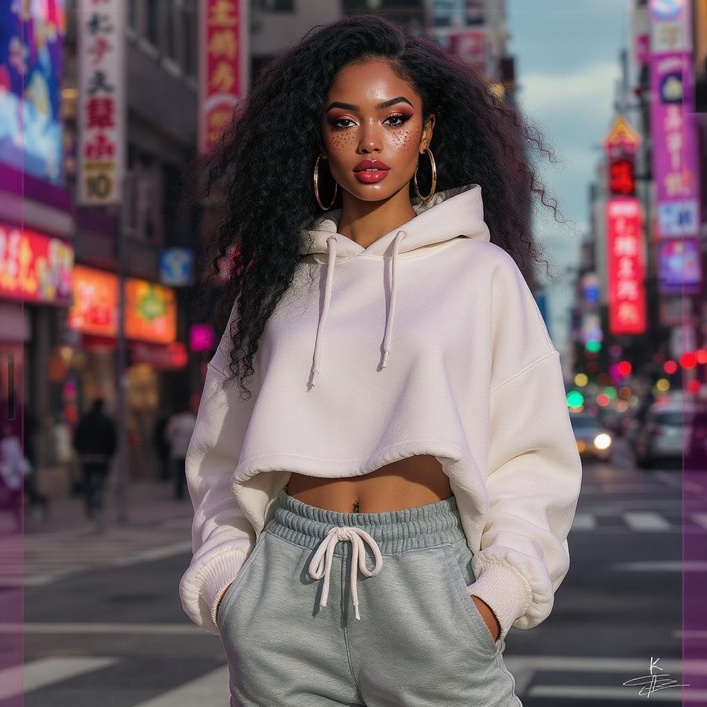 A stunning multiracial woman with unique freckles models a stylish, casual athleisure outfit against a vibrant cityscape backdrop, captured in a full-body character concept art. The design embodies elegance and intricate detail with her symmetrical face and perfectly proportioned body. This illustration exudes cinematic color grading and an editorial photography vibe, showcasing high fashion with hyperrealism that resonates as a trending masterpiece on ArtStation. Inspired by the artistic finesse of Guweiz, the artwork is meticulously detailed and refined, incorporating visual effects and post-processing techniques with an Octane render, all in breathtaking 8k resolution.