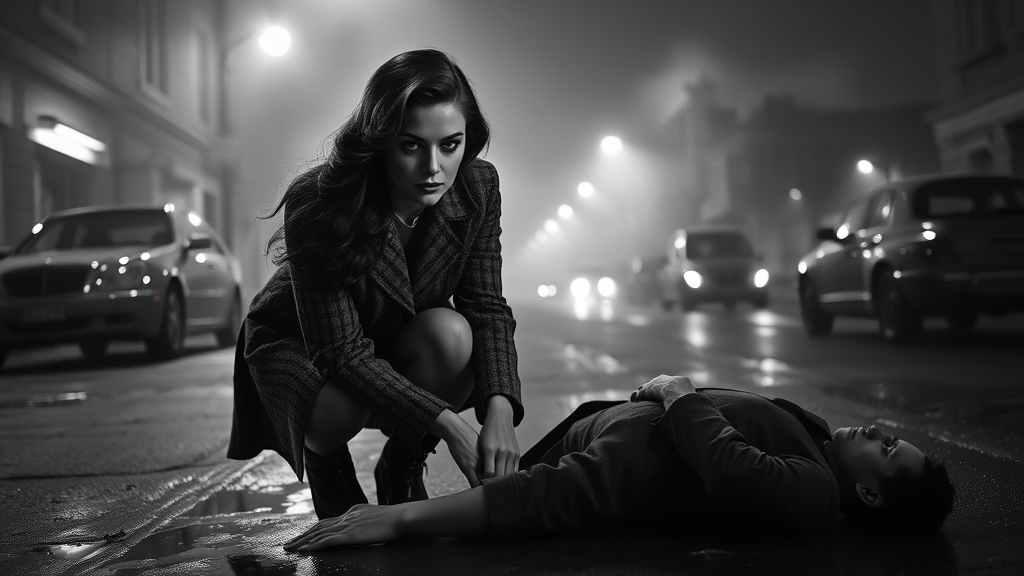 A stunning noir 1940s detective woman, depicted in a high-contrast black and white film style, is kneeling down in front of a lifeless body on a misty, fog-laden 1940s street. Her long, shiny hair cascades around her shoulders as her dark, reflective eyes survey the scene, enhanced by subtle, classic makeup. Despite her slender figure, the atmosphere around her is thick with tension and dust particles floating through the dramatic, rim-lit scene. Street lights cast pools of light onto puddles reflecting the surroundings. The setting is detailed with a vintage touch, yet modern cars slightly break the time illusion. The depth of field and shallow focus draw attention to the poignant moment, as her tweed outfit fits the noir aesthetic flawlessly. The environment captures the gritty realism and suspense typical of the era, with the detective's poise and beauty highlighted amidst the dramatic lighting and evocative shadows.