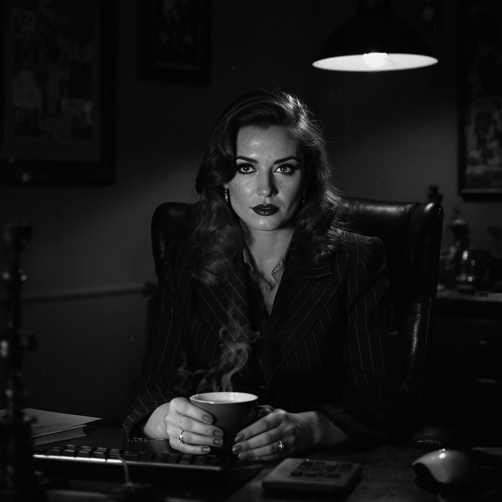 A stunning noir 1940's detective woman in high contrast black and white film style, sitting at a desk with a cup of hot coffee. She's a private investigator with long, shiny hair and a face adorned with freckles, showcasing detailed symmetry. Her expressive dark eyes are the focal point, enhanced by subtle makeup. The setting is illuminated by dramatic rim lighting and a classic ceiling lamp, casting intriguing shadows and highlighting dust particles in the air. Clad in pinstripe trousers, she embodies the essence of a classic film noir character. Meanwhile, the atmosphere is enriched by depth of field and shallow focus photography. The environment includes a keyboard and mouse on the desk, contributing to the period ambiance. Despite elements like muted colors and detailed lighting, avoid distortions like extra limbs or disproportionate features that compromise anatomical correctness, ensuring the scene remains realistic and artistically cohesive.