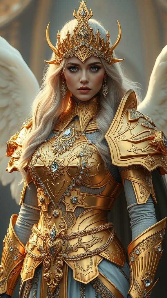 A stunning Noridian blonde warrior adorned in divine armor crafted from shimmering gold and encrusted with brilliant diamonds, her ensemble exudes an ethereal glow. The intricate details of her armor are both formidable and fashionable, showcasing a blend of celestial elegance and regal power. Her poised stance reflects strength and grace, captivating attention as she stands amidst a backdrop reminiscent of a divine realm. The scene captures the essence of high fashion with its exquisite attention to detail and luxurious materials, presented in a breathtaking 8k resolution that highlights every facet of this heavenly warrior's majestic presence.