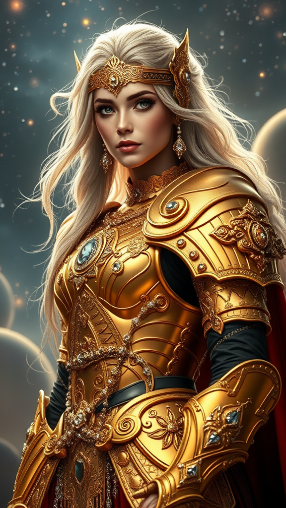 A stunning Noridian blonde warrior clad in a divine armor intricately crafted from gleaming gold and encrusted with dazzling diamonds, her radiant presence exuding an ethereal aura. Standing tall against a celestial backdrop, the high-detail rendering captures every facet of her luxurious battle attire, reflecting the light in mesmerizing patterns. The intricate design of her armor blends ancient elegance with a fashion-forward twist, creating a captivating blend of classical and contemporary aesthetics. Each element, from the intricate filigree to the meticulously placed jewels, tells a story of elegance and strength, embodying a balance of divine protection and opulent style. Set in an 8k resolution, the scene is a visually arresting masterpiece destined to trend on platforms like ArtStation, blurring the lines between fantasy and fashion in an exquisite showcase.