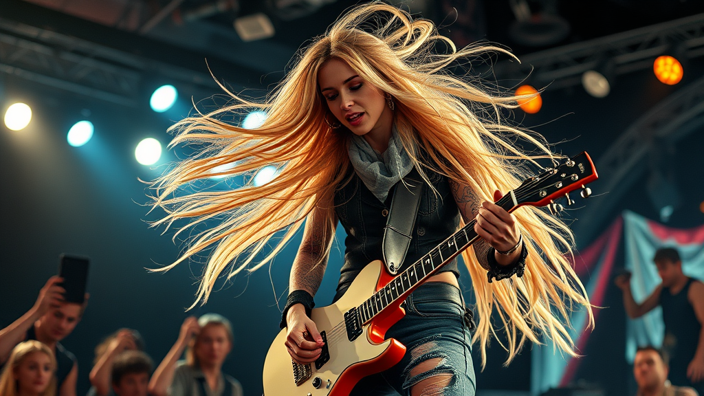 A stunning Norwegian female rockstar captivates the audience, performing passionately on stage. Her long, flowing blonde hair cascades in a beautifully chaotic mess as she rocks to the beat. Dressed in stylishly ripped jeans and adorned with iconic rockstar accessories, she embodies the essence of modern rock culture. The scene is captured in a full-body photograph, showcasing her charismatic stage presence. Cinematic and diffused soft lighting highlights her expressive features, while realistic details bring the image to life with photo-realistic clarity. The depth of field is shallow, emphasizing her dynamic movement, yet the focus remains sharp and crisp. Real shadows add depth, enhancing the hyperrealism of the scene. Despite its 8k resolution, there's a gentle cinematic noise that adds an authentic touch. Her skin is rendered with meticulous detail, capturing every nuance of her performance. The overall composition remains true to its source of inspiration, while maintaining a refined and polished aesthetic.