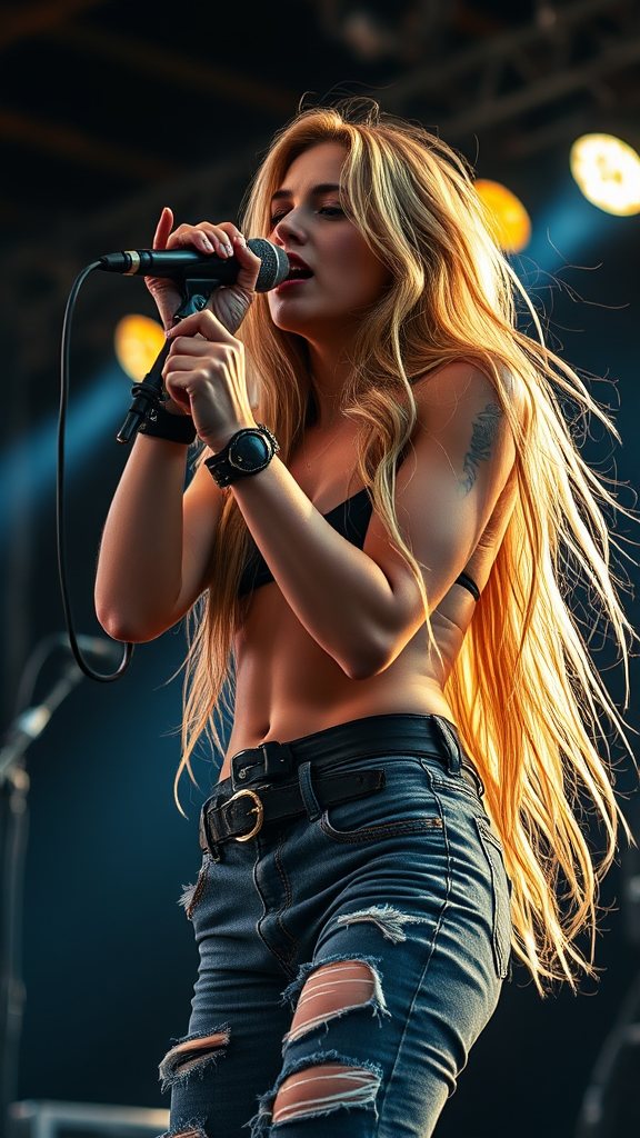 A stunning Norwegian female rockstar passionately singing on stage, her long, tousled blonde hair cascading around her. She wears stylishly ripped jeans and rockstar accessories that perfectly complement her dynamic presence. The scene is captured in full-body photography with cinematic lighting, featuring soft, diffused illumination and subtle cinematic noise. Her skin appears highly realistic and detailed, with the photo exhibiting a shallow depth of field and sharp focus. The authenticity of real shadows enhances the hyperrealism of the scene, captured in 8k resolution. The composition is free of common visual flaws, ensuring she appears natural and captivating, embodying the essence of a talented musician.