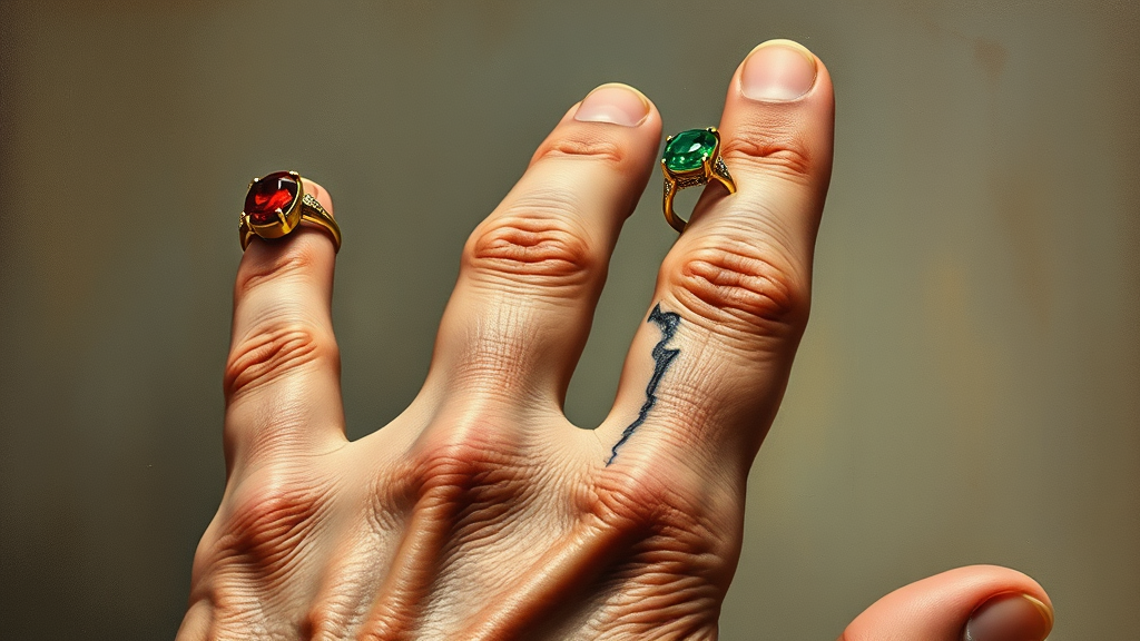 A stunning oil painting captures an aged hand, showcasing a rich history and character. On one finger rests a magnificent golden ring, adorned with a striking red gemstone that catches the light. Another finger boasts a sleek silver band, featuring a vibrant green emerald that exudes elegance. The fingers, gracefully extended towards the sky, tell a story of resilience with a deep, mysterious scar etched into the weathered skin. This hand, with its five fingers, narrates a silent tale of time, adorned and dignified, reaching beyond the canvas.