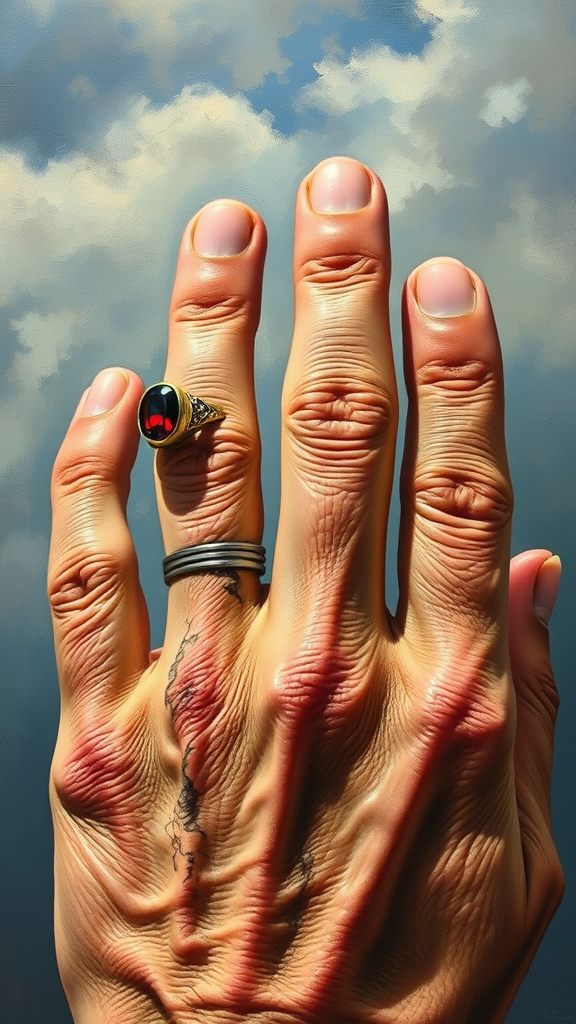 A stunning oil painting capturing an aged hand, adorned with a single golden ring featuring a striking red gemstone and another finger wearing a silver ring with a brilliant green emerald. The fingers elegantly reach toward the sky, and a deep, time-worn scar adds character. The hand, with its natural beauty, gracefully displays its five fingers.