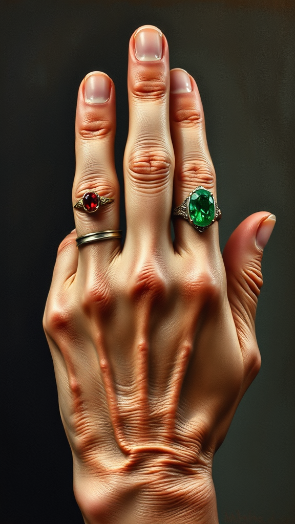A stunning oil painting depicting an aged hand, adorned with a single golden band set with a brilliant red gem and another finger graced by a silver ring showcasing a striking green emerald. The fingers are elegantly poised, pointing upward, and the hand bears a deep, timeless scar, with all five fingers present.