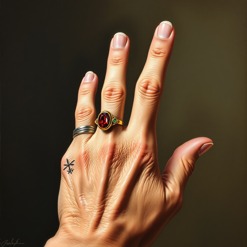 A stunning oil painting depicting an aged hand adorned with a single golden ring set with a striking red gemstone and another finger bearing a silver band with a vibrant green emerald, its fingers elegantly reaching skyward. The hand, marked by an ancient, deep scar, displays a dignified, timeless character, boasting five distinct fingers with the rings catching the light beautifully. The expert brushwork highlights the intricate textures of the wrinkled skin and the gleaming jewels, creating a captivating and emotive piece.