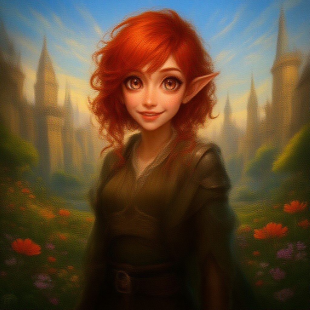 A stunning oil painting inspired by D&D fantasy, featuring a slender, beautiful character with short, wavy, fiery red hair adorned with freckles. She smiles warmly at the viewer, her pointed ears hinting at her elven heritage. This cleric wears an intricately detailed adventurer outfit, numbered #3238, and her mesmerizing 8k eyes follow the golden ratio, with big, dreamy, anime-like qualities. Her face is crafted with hyper-detailed precision, reflecting light subtly on her vibrant hair. The scene is enriched with complementary colors, presenting her as a top model cover star amidst a glamorous, hyper-detailed medieval city backdrop. The scene offers a breathtaking, colorful, and scenic view of a medieval city, highlighted by cinematic lighting and octane render. Volumetric lighting enhances the atmosphere, intertwining with vibrant flowers and a lush garden in the foreground. The artwork achieves an immaculate balance of concept art and fascinating detail, utilizing deep colors, dramatic and ambient lighting to produce god rays. Elements of FastNegativeV2, UnrealisticDream, and BadDream provide intriguing contrast to the beauty of this imagined reality.