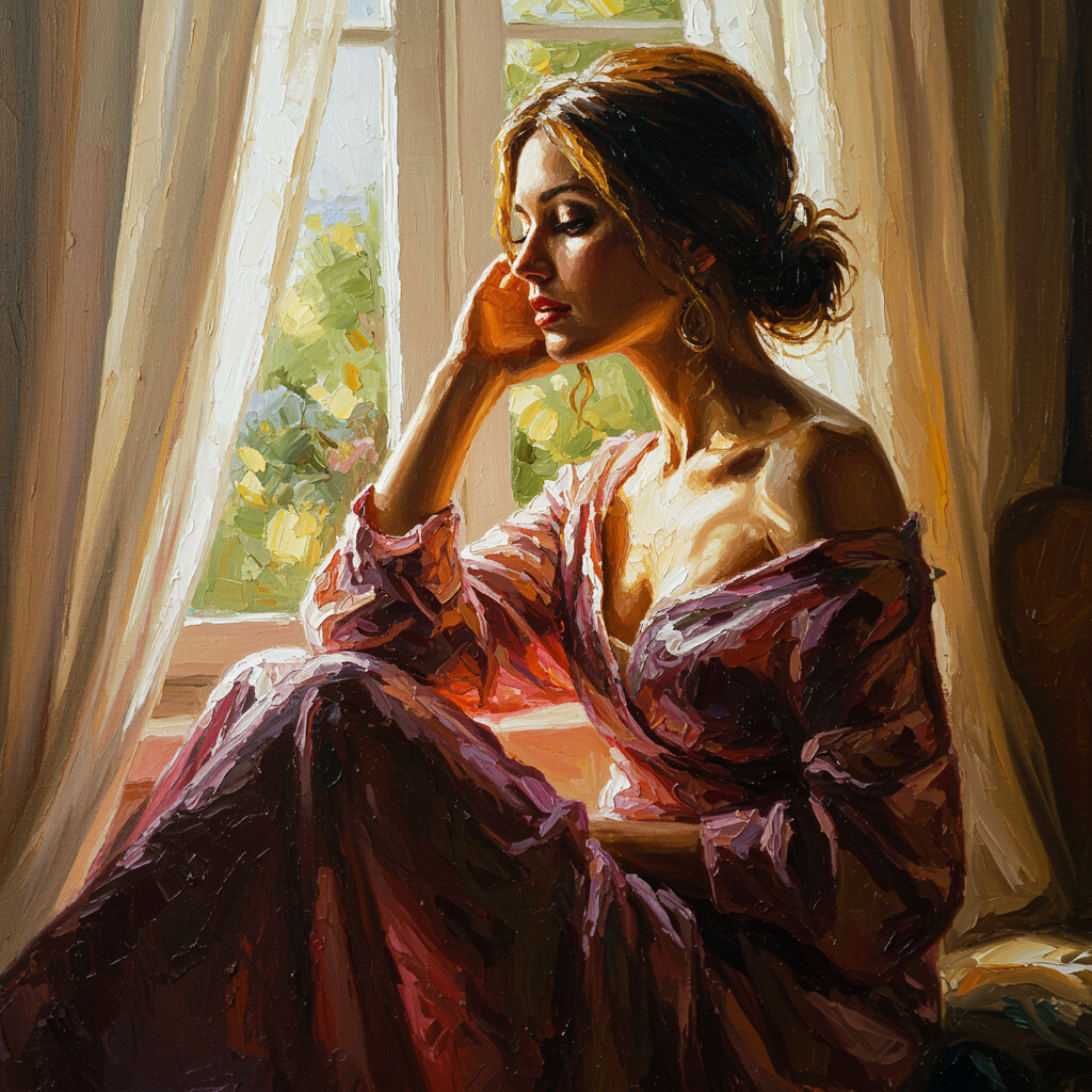 A stunning painting captures a woman seated gracefully by a sunlit window, her expression serene and contemplative. The style exudes elegance, with intricate details woven playfully throughout her flowing dress, each brushstroke thick with impasto, lending the canvas a vivid texture that mesmerizes. The colors are rich and lush, a perfect blend of romance and realism, showcasing the artistry in every curve and shadow. Her beauty is breathtaking, almost ethereal, framed perfectly by the gentle light filtering through sheer curtains. The scene is intimate, a close-up that draws the viewer into her world, an exquisite blend of classic charm and modern flair.