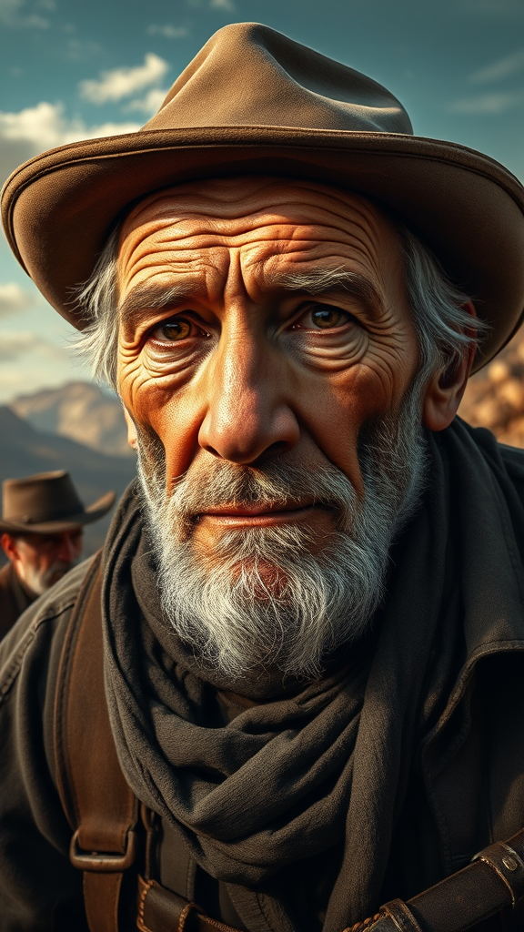 A stunning painting depicting an elderly coal miner from the 19th century, his face richly detailed and weathered, embodying the hard life of the wild west. Set against a rugged, authentic landscape, his eyes tell stories of resilience and grit. Inspired by the artistic styles of Greg Rutkowski and Magali Villeneuve, the masterpiece captures the miner's spirit under the expansive western sky, reminiscent of an 8k high-definition photograph. Subtle adjustments in lighting and shadow enhance the depth and emotion of the scene, adding a touch of realism to this timeless portrait.