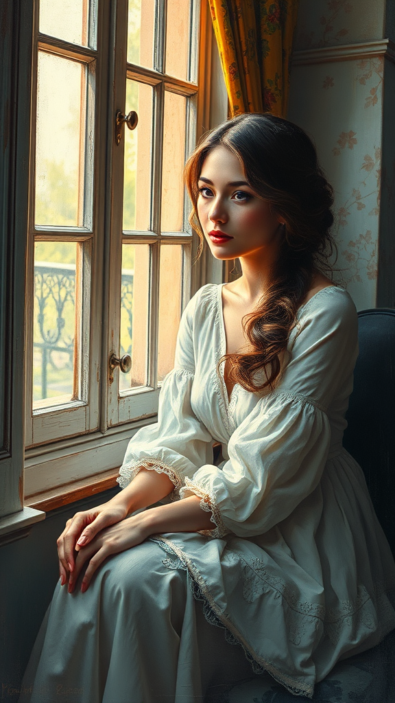 A stunning painting depicts a woman seated gently by a sunlit window, embodying the essence of timeless beauty. Intricately detailed with playful textures and heavy impasto, the scene is almost unbelievable in its breathtaking allure. Romantic flourishes add a touch of elegance to her contemplative gaze. The close-up perspective highlights the rich colors and delicate interplay of light and shadow, creating an atmosphere filled with serene grace and captivating charm.