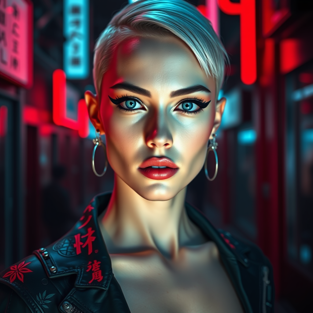 A stunning pale cyberpunk woman with striking blue eyes and a shaved side haircut, adorned with dramatic black eyeliner, standing in a dark red futuristic city. The scene is captured with hyper-detail and cinematic lighting, casting a mystical glow of magic neon lights around her, illuminating her features as she exudes an enigmatic presence.
