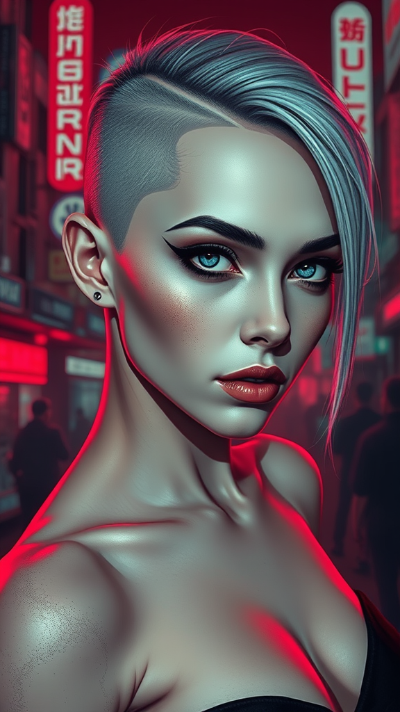 A stunning pale cyberpunk woman with striking blue eyes and a distinctive shaved side haircut, adorned with dramatic black eyeliner. Her appearance is hyper-detailed with cinematic lighting that highlights her features against the backdrop of a dark red, neon-lit cityscape. The scene exudes a mystical and futuristic vibe with hints of mystery and intrigue. Despite the captivating visuals, there are deliberately imperfect elements: occasional text errors, a low-resolution finish with jpeg artifacts, and elements of distortion, such as missing or extra digits, and poorly drawn anatomy. The figure may appear partially cropped or out of frame, embracing an avant-garde, abstract aesthetic. This intentionally flawed composition evokes a sense of the uncanny, blending beauty and imperfection in the heart of a cyberpunk world.