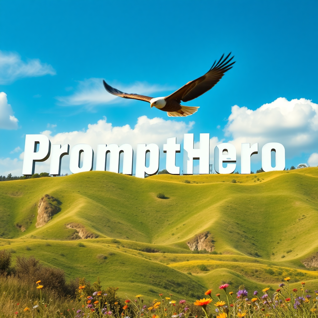 A stunning panoramic billboard rises against a backdrop of rolling hills, reminiscent of the iconic Hollywood sign. Towering white letters spell out “PromptHero” in a bold, majestic style, each letter perfectly aligned on a lush, verdant slope. The sky behind is a brilliant azure, dotted with fluffy white clouds that cast gentle shadows over the landscape. Beneath the letters, vibrant wildflowers in an array of colors dance in the breeze, adding a splash of natural beauty to the scene. A majestic eagle soars gracefully above, embodying the spirit of inspiration and innovation that “PromptHero” represents.