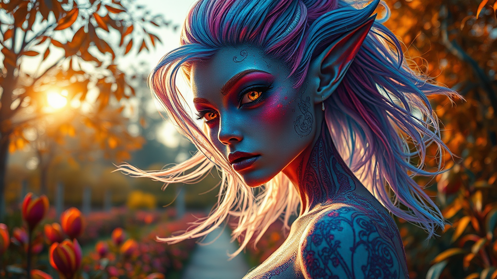 A stunning perspective of an ethereal alien woman with iridescent, multicolored hair and captivating, vibrant eyes, gracefully moving through an autumnal garden at dawn with a gentle breeze. The scene is reminiscent of an alcohol ink painting, infused with psychedelic artistry. Influences of Ross Tran, Antonio J. Manzanedo, Tom Bagshaw, and Mandy Disher are evident in the cinematic quality, akin to stills from a Spielberg epic. The artwork boasts a sharp, hyperrealistic finish with intricately detailed character design, evoking the grandeur of a repin ArtStation masterpiece, enveloped in the expansive depth of a matte painting.