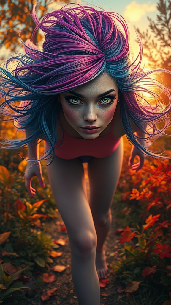 A stunning perspective of an extraterrestrial woman with iridescent, multicolored hair and mesmerizing, vibrant eyes, running through an autumnal garden at dawn with a gentle breeze, reminiscent of an alcohol ink painting. Inspired by the psychedelic art styles of Ross Tran, Antonio J. Manzanedo, and Tom Bagshaw, this scene evokes the cinematic grandeur of a Steven Spielberg epic film. Capturing hyperrealistic and intricately detailed character design, this artwork embodies a vivid moment, portrayed as if it's a repin from an ArtStation masterpiece and a matte painting with 32k clarity.