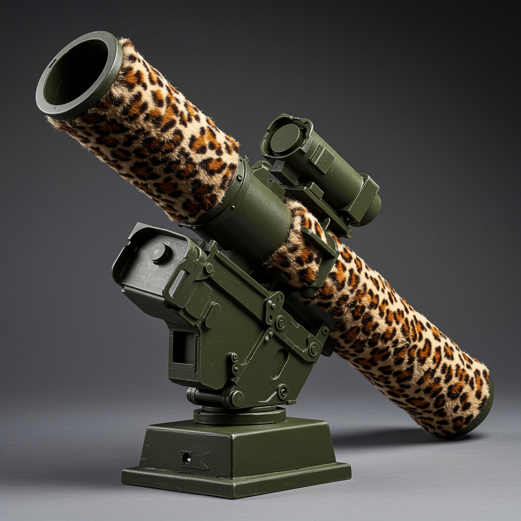 A stunning photo of an antitank missile launcher transformed into an art piece, featuring a BGM 71 TOW launcher artistically enveloped in luxurious leopard-print fur. This evocative exhibition aims to spark contemplation, juxtaposing the hard, mechanical nature of the launcher with the softness and elegance of the animal texture. Captured in a professional photography studio against a neutral grey backdrop, the composition highlights an intriguing contrast between the solid structure and the delicate fur. The setup includes professional studio lighting with softbox light and a bokeh effect. The camera is positioned at a 45-degree angle, offering a close-up view with a 35mm lens, ISO 100, low shutter speed, and aperture f4. The result is a high-quality, stock-worthy digital photograph that exemplifies professional product photography.