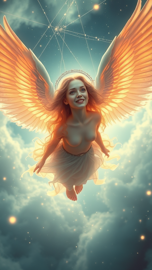 A stunning photograph captures a celestial being with radiant wings gracefully descending from the heavens, exuding an aura of fantasy and magic. This ethereal figure appears to float effortlessly, surrounded by a dreamy atmosphere with gentle particle effects. The scene is depicted with a wide-angle lens, ensuring a lush and detailed background that enhances the lifelike presence of the being. The face is intricately detailed, reflecting the mastery of professional digital painting. This artwork, reminiscent of creations by Artgerm, Greg Rutkowski, Alphonse Mucha, Loish, and WLOP, is rendered in soft pastel colors, achieving a level of photorealism that resonates at 8k resolution. The lighting is crisp and enhances the heavenly aura, creating a piece that's trending on art platforms like Tumblr.