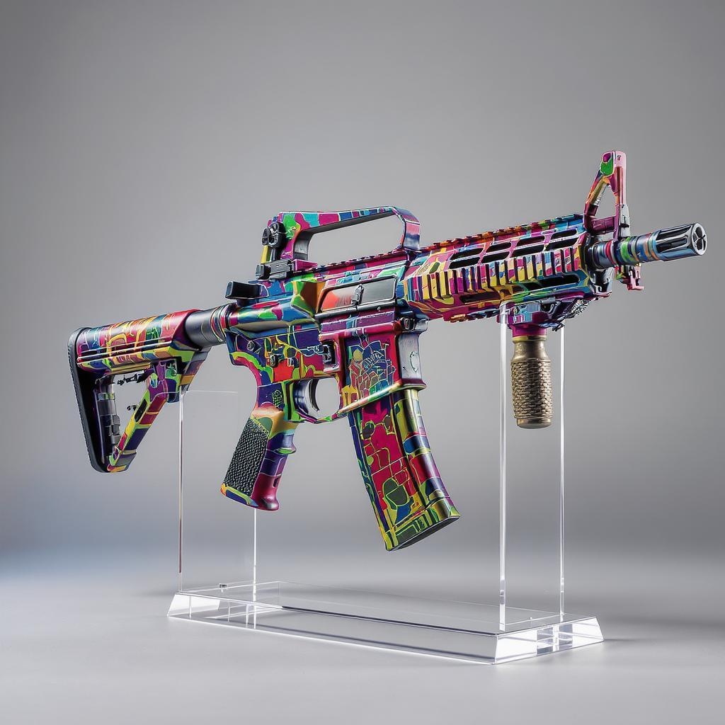 A stunning photograph captures an AR15 rifle transformed into a striking art piece, featuring a spectrum of bright, psychedelic colors that cover the entire ArmaLite AR-15. The weapon is displayed with precision on a sleek modern acrylic art stand, inviting viewers to contemplate its artistic and symbolic nature. The vibrant, unusual colors create a captivating contrast with the formidable structure of the rifle, evoking themes of war and peace. The setting is a professional photography studio, utilizing a neutral light backdrop and diffused lighting to enhance the visual impact. The shot, taken from a 45-degree angle, offers a close-up view using a Sony A7S III with a 35mm lens, set at ISO 100, low shutter speed, and aperture f4. The image exemplifies high-quality professional product photography, featuring a smooth bokeh effect that adds depth and focus to the artwork. This digital photograph is a high-resolution stock image with no text, signature, or watermarks.