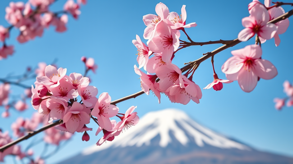 A stunning photograph captures cherry blossoms at their peak, with Mount Fuji's serene grandeur in the background, inspired by Takashi Komatsubara's unique style. The composition highlights the fragile allure of cherry blossoms, depicted in exquisite detail. The rich pink petals glow in the crisp morning light, contrasting beautifully with the deep blue sky and the snowy summit of Mount Fuji. Photographed using a Canon EOS R with a 70-200mm f/2.8 lens, settings include an aperture of f/5, ISO 100, and a shutter speed of 1/1500 sec to ensure perfect exposure and sharpness. Post-processing enhances the image, with subtle adjustments to color balance, contrast, and saturation, creating a captivating and memorable artistic piece. Ultra-detailed, Super-Resolution, UHD, HDR, 8K quality.
