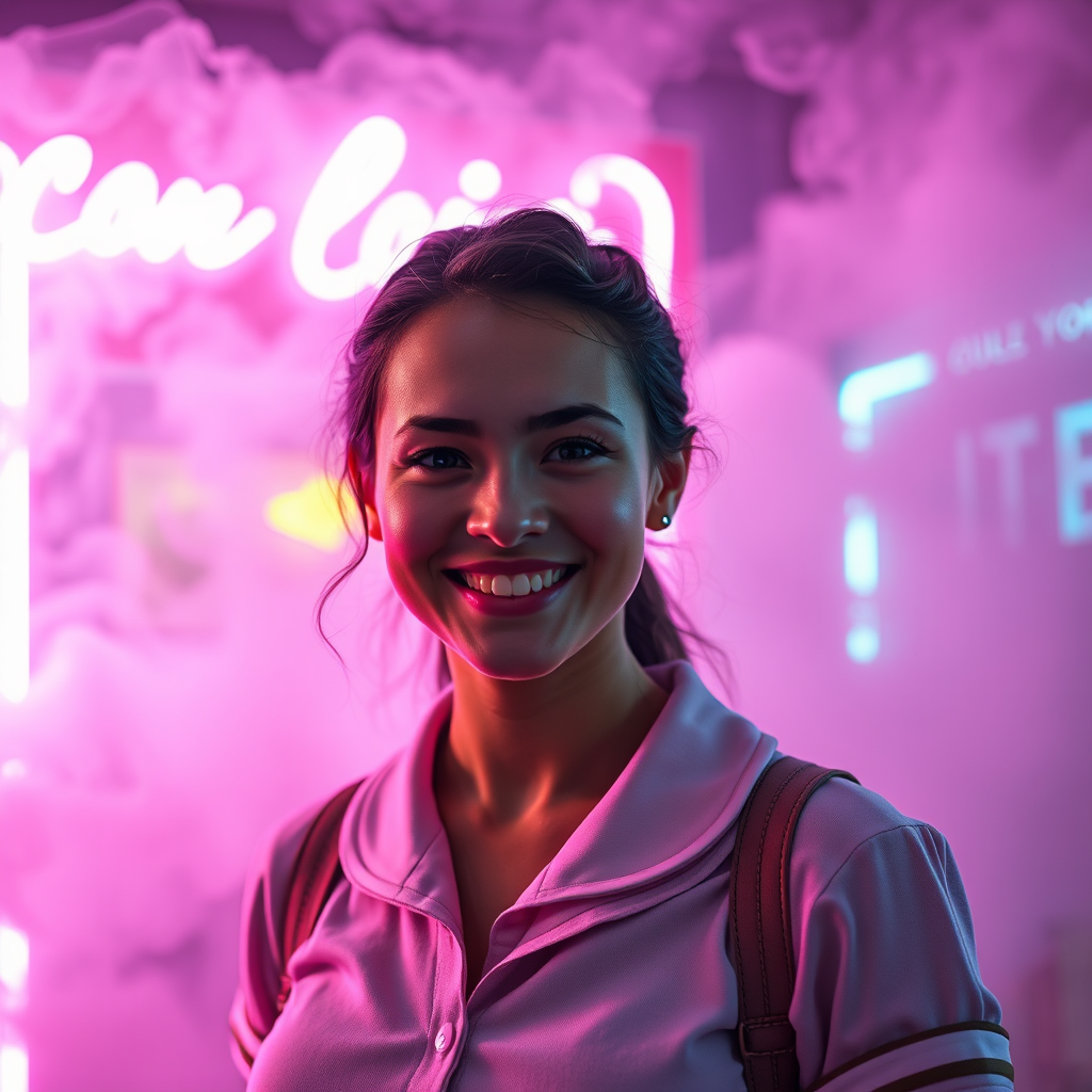 A stunning photograph capturing Anya Taylor-Joy beaming brightly, dressed in a chic preppy schoolgirl outfit, her olive-toned skin glowing and her flawless features perfectly highlighted. The backdrop is a mesmerizing mix of neon light and swirling smoke, enveloped in volumetric fog, creating a dreamlike ambiance. The scene is crafted in hyperrealistic detail, with soft indirect lighting that accentuates every intricate feature, resulting in a captivating and breathtaking image in 8k UHD quality.