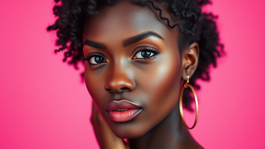 A stunning photograph featuring a black woman model posed against a solid hot pink backdrop, accentuating her elegant presence. The focus highlights her expressive eyes with intricate detailing, utilizing a camera setup that mimics a large aperture of f/1.4 to create a soft, dreamy background. The image captures the essence of modern style with the model's poised demeanor and subtle accessories, maintaining a raw, authentic feel. The scene exudes vibrant energy, with the hot pink hue amplifying the bold and confident aesthetic of the composition.