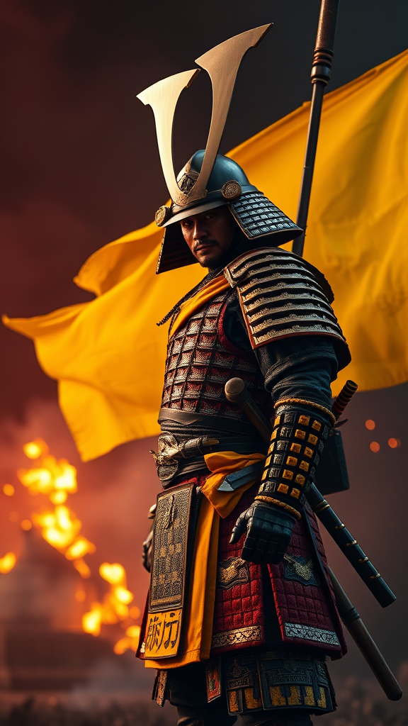 A stunning photograph of a samurai warrior with a vibrant yellow war flag banner, showcasing his full body in intricate yellow and black armor. The scene features ornate cinematic lighting and high definition, emphasizing vivid illumination and trending hyperrealism. Created with Unreal Engine 5, the details are sharp and focused, set against a dark, reddish war-torn environment filled with smoke and glowing embers. Lumen reflections enhance the cinematic depth of field, capturing the intensity and drama of the moment.