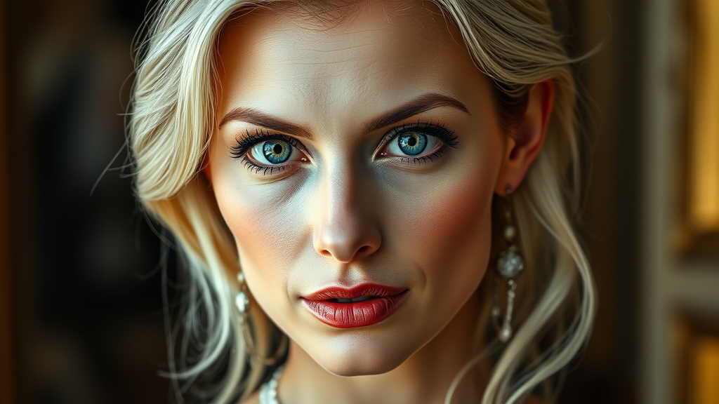 A stunning photograph of a woman with a captivating gaze, embodying the elegance of a 40-year-old. She stands in a full-body pose, captured with a Leica 50mm lens for the highest quality and resolution. The lighting is exquisite, reminiscent of classic Hasselblad photography, highlighting her textured, naturally imperfect skin. Her blonde hair frames her face beautifully, offering an airbrushed yet realistic appeal. The image blends elements of 3D render, painting, anime, and manga illustration styles, challenging traditional anatomy with an artistic twist. Features like big eyes, subtle piercings, and unique character enrich her expression, offering a smooth, almost cartoon-like quality without compromising her mature essence. Her appearance is ornate yet realistic, with jewelry adding a touch of sophistication.