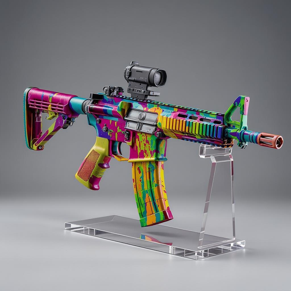 A stunning photograph of an AR15 rifle, transformed into a vibrant art piece, with an ArmaLite AR-15 adorned in vivid psychedelic hues. It rests on a sleek modern acrylic stand, designed to spark contemplation by showcasing a uniquely camouflaged weapon and magazine. Captured in a professional studio with a neutral backdrop, the composition highlights a captivating contrast between the weapon and its bright, unconventional colors, symbolizing themes of conflict and harmony. Achieved with expert studio lighting, employing diffused light and subtle bokeh. The camera captures this from a 45-degree angle, focusing close-up with a Sony A7S III using a 35mm lens, ISO 100, at a low shutter speed, with an aperture of f4. The result is a high-quality stock image in digital photography, highlighting the interplay of art and symbolism in a compelling visual narrative.