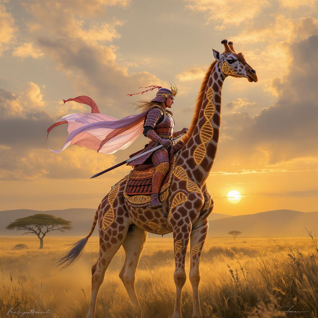 A stunning photorealistic artwork depicting a samurai riding majestically atop a giraffe, with intricate DNA strand motifs woven into the armor and saddle, set against an ethereal sunset. The scene captures the emotion and spirit of a mythical journey, evoking a sense of serene determination and unity. The lighting and textures bear the signature style reminiscent of Dmitri Danish's emotional depth and Marcin Sobas's atmospheric landscapes, emphasizing an evocative mood over strict realism.