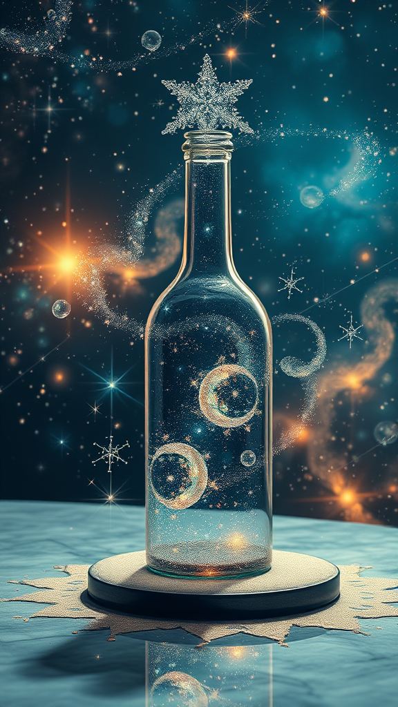 A stunning photorealistic painting showcasing a glass bottle resting on a table, surrounded by an ethereal cosmos. The scene features stars and galaxies swirling within and around the bottle, creating a modern fantasy atmosphere. Intricate, glittering multiversal ornaments adorn the composition, as if capturing the universe in a grain of sand. Masterful photo manipulation techniques craft a beautiful, detailed render with captivating light effects, offering a breathtaking exploration of conceptual art.