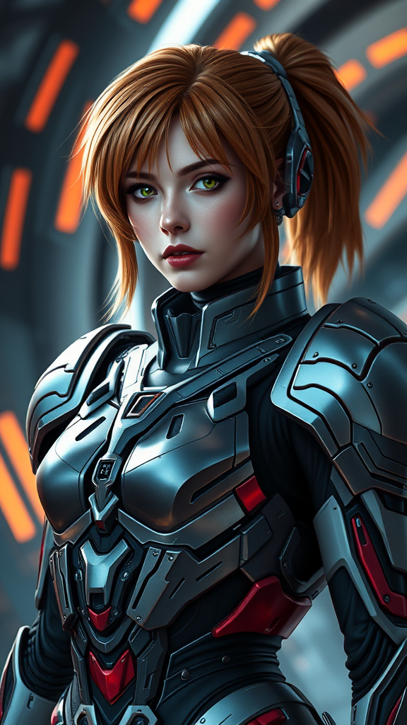 A stunning photorealistic portrait of Asuka Langley, adorned in intricate and elegant sci-fi armor, capturing her confident and fierce demeanor in crisp detail, set against a futuristic backdrop with rich textures and vivid colors, showcasing a harmonious blend of advanced technology and human expression.