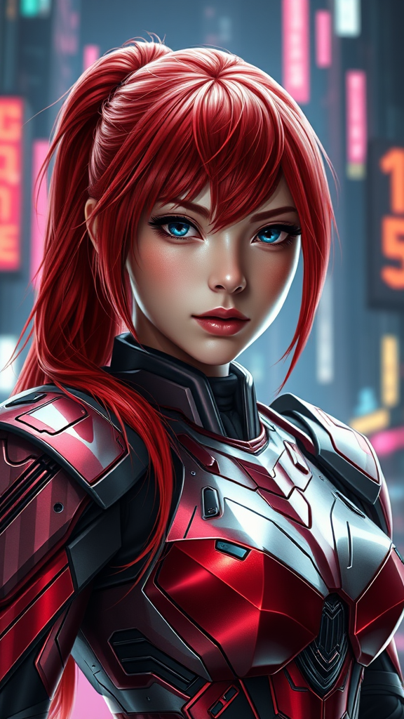 A stunning photorealistic portrait of Asuka Langley in sleek, futuristic sci-fi armor, her expression embodying determination and strength, vibrant red hair framing her face with intricate armor details reflecting light, set against a futuristic cityscape backdrop with neon hues, capturing a 1:2 aspect ratio with enhanced visual quality and depth.