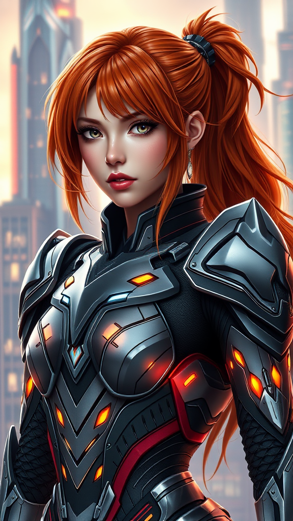 A stunning, photorealistic portrait of Asuka Langley, adorned in intricately designed sci-fi armor that combines elegance and futuristic technology. The armor features sleek lines and glowing accents, perfectly complementing her striking features and fiery red hair. The background is a dynamic, futuristic cityscape that adds depth to the scene. Her confident expression and poised stance exude strength and determination, capturing the essence of a warrior in a captivating, lifelike image.