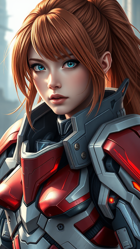 A stunning photorealistic portrait of Asuka Langley adorned in sleek sci-fi armor, her expression powerful and confident, with intricate details that capture blends of futuristic technology and elegance, the background hinting at a high-tech cityscape, vivid lighting enhancing her features and armor texture, maintaining an epic and dynamic atmosphere.