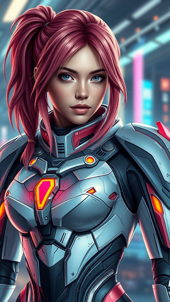 A stunning photorealistic portrait of Asuka Langley in futuristic sci-fi armor, capturing her striking beauty and determined spirit, with intricate detailing on the suit that reflects advanced technology and vibrant colors, accentuating her dynamic pose and intense gaze. The background is a blend of a high-tech environment with subtle hints of a digital cityscape, enhancing the overall atmosphere while maintaining a ratio of 1:2 for a dramatic visual impact.
