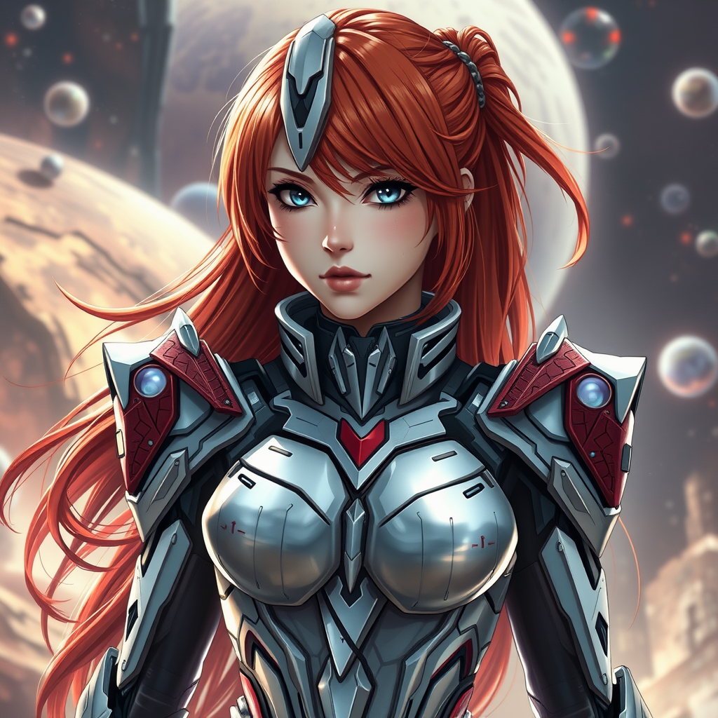 A stunning photorealistic portrait of Asuka Langley, featuring her in intricately designed sci-fi armor that seamlessly merges technology with elegance, accentuating her fierce yet graceful demeanor, set against a dynamic, otherworldly background that highlights her vibrant red hair and determined expression.