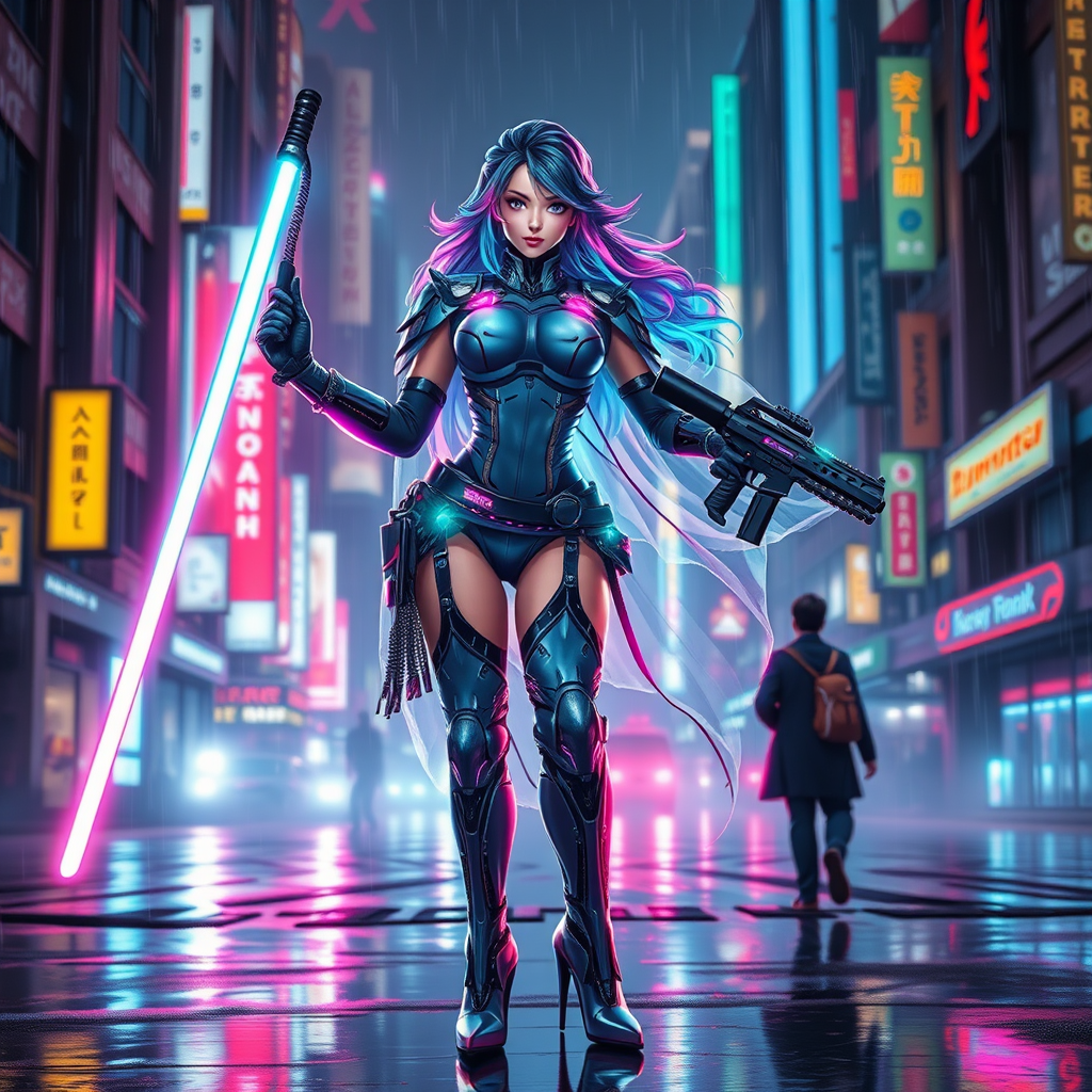 A stunning photorealistic portrayal of a futuristic female warrior set in a vibrant cyberpunk cityscape. She stands confidently in sci-fi armor adorned with neon accents, her multi-colored glowing hair flowing with urban nostalgia. The scene captures her poised with a sleek laser saber in one hand and a scifi gun in the other, both reflecting the city’s dazzling lights. Rain adds a dramatic sheen to her high-heeled boots and transparent cape, while her large, expressive eyes and confident smile convey readiness for battle. Her intricately detailed face is reminiscent of the majestic oil paintings by Ed Binkley and Jeremy Mann, blending with the stylized narrative touch of Studio Ghibli. Lens flares enhance the vibrant neon ambiance, further enriched by the intricate texture and detail achieved by artists like Gregory Manchess and Antonio Moro. The art, trending on platforms like ArtStation and CGSociety, embodies a blend of realism and stylized vision, avoiding any unnecessary blurriness or distortions. The composition highlights a flawless anatomy and dynamic posture, inviting admiration for its precision and beauty.