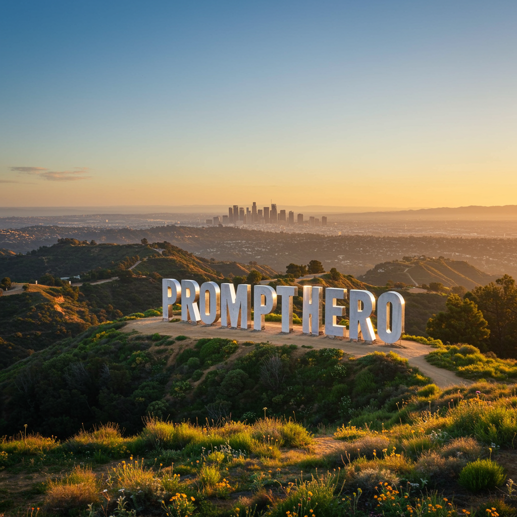 A stunning photorealistic scene of a sprawling hillside reminiscent of the iconic Hollywood landscape, with large, bold letters spelling "PromptHero" straddling the crest of the hill. The letters, made of polished chrome, reflect the sunlight, creating dazzling beams that shine against a clear blue sky. Lush greenery surrounds the hillside, dotted with wildflowers that add pops of color. In the distance, a city skyline can be seen under a golden sunset, adding a sense of adventure and limitless possibility to the inspiring vista.