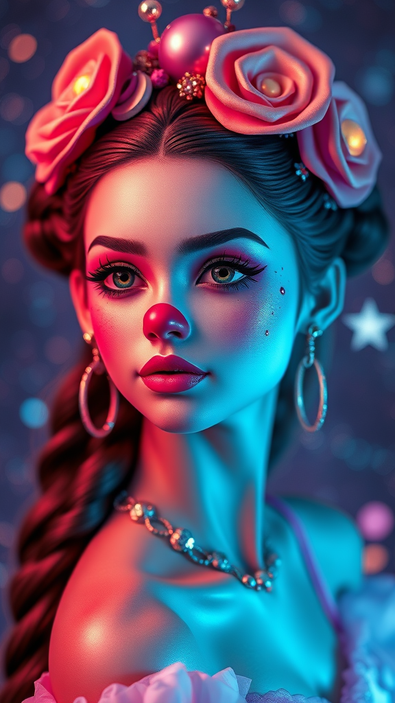A stunning Pixar-inspired 8k portrait photo of a beautiful, radiant cosmic prima ballerina merging clowncore aesthetics with Russian cyborg intricacy. This rich galactic college girl embodies the golden ratio with exquisite sci-fi and fantasy elements. Embracing a cyberpunk theme, the artwork is decadent and highly detailed, reminiscent of Ever After High with an octane render quality. The image is polished with a smooth, sharp focus, evoking the style of renowned artists like Artgerm, Loish, and Wlop, featuring a fantastical blend of concept art and a vibrant illustration.
